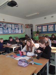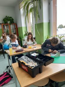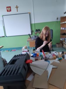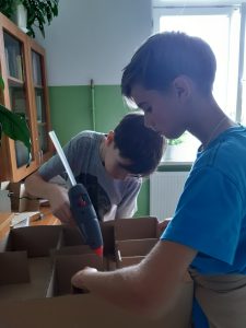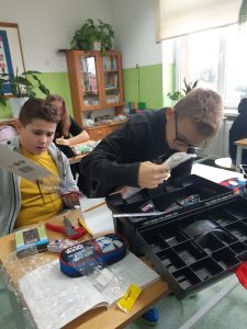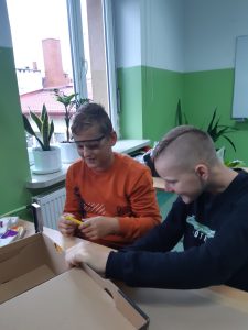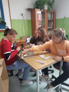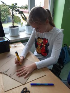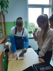 Uczniowie klasy VI A i VIB na lekcjach techniki projektowali i wykonywali umeblowanie mieszkania. Podczas zajęć posługiwali się narzędziami zakupionymi w ramach programu Laboratoria Przyszłości. W obecności nauczyciela, z zachowaniem zasad bezpieczeństwa korzystali z pistoletów do kleju na gorąco, noży oraz nożyczek.