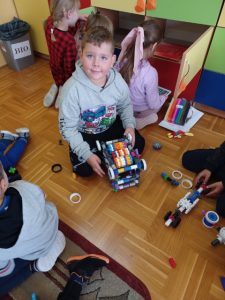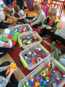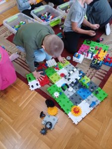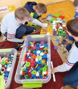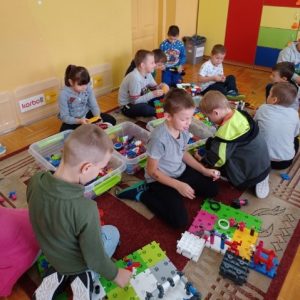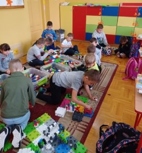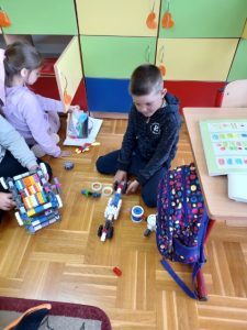 Uczniowie klasy 1b z ogromnym zainteresowaniem korzystają z klocków KORBO zakupionych w ramach programu Laboratoria Przyszłości. Duża ilość kolorowych klocków pozwala w ciągu jednej godziny lekcyjnej na stworzenie dróg, przeszkód i ciekawych zadań. Takie działania dają możliwość pracy dla całej grupy dzieci – dla tych, którzy lubią bardziej pracować z robotami i je programować i dla tych, którzy mogą tworzyć dla robotów zadania. Dzieci ćwiczą umiejętności kompetencji miękkich, które są potrzebne przy pracy w grupach, pracy nad projektami, programami, tam gdzie wymagana jest obecność więcej niż jednej osoby. Tutaj wykorzystujemy również myślenie analityczne i logiczne, zdolność dostrzegania związków przyczynowo – skutkowych. Klocki Korbo są również świetnym konkretem, na którym uczniowie pracują rozwijając inteligencję matematyczną wykonując działania m.in. dodawanie, odejmowanie elementów, przekładanie, dopełnianie do pełnej liczby, grupowanie wg cech, tworzenie zbioru, tworzenie sekwencji oraz systemu dziesiętnego.