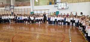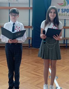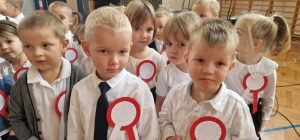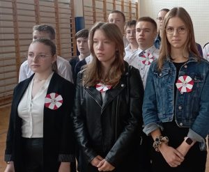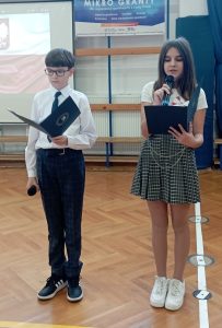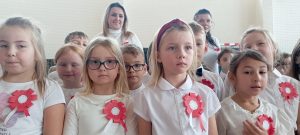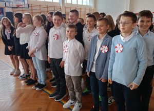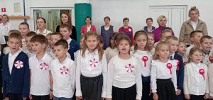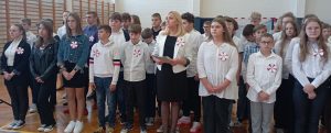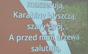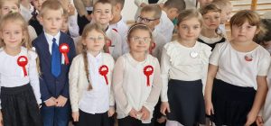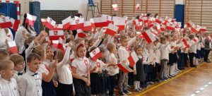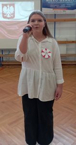 W części artystycznej wysłuchaliśmy informacji nt. odzyskania niepodległości oraz recytacji wiersza „Opowiedz nam Ojczyzno” w wykonaniu Wiktorii Król, uczennicy klasy VIIa. Na zakończenie wspólnie zaśpiewaliśmy pieśń legionową „Szara Piechota”.