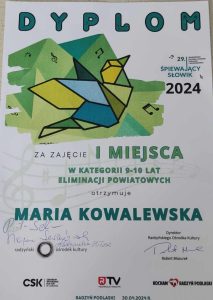 zajęli 🥇 MIEJSCA w swoich kategoriach wiekowych na Powiatowych Eliminacjach Konkursu „Śpiewający Słowik”, który odbył się w Radzyniu Podlaskim.
