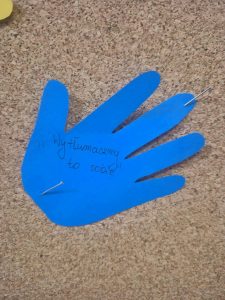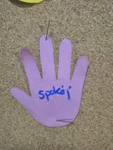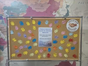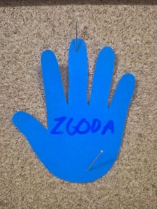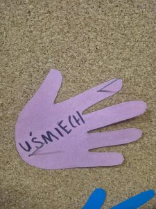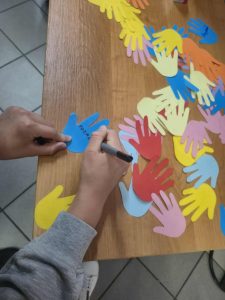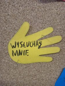 Uczniowie wpisywali na kolorowych łapkach słowa, które budują porozumienie – takie jak szacunek, zaufanie, empatia, rozmowa, zrozumienie. Dzięki temu wspólnie stworzyliśmy symboliczny mural dobrych słów!