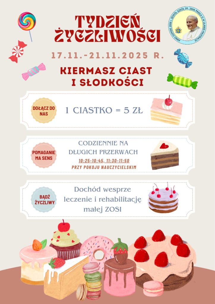 W dniach 17-21 listopada w naszej szkole po raz kolejny będziemy wspólnie świętować Tydzień Życzliwości – we współpracy z Samorządem Uczniowskim organizujemy w tych dniach kiermasz ciast, a zebrany dochód zostanie przeznaczony na leczenie i rehabilitację małej Zosi ♥