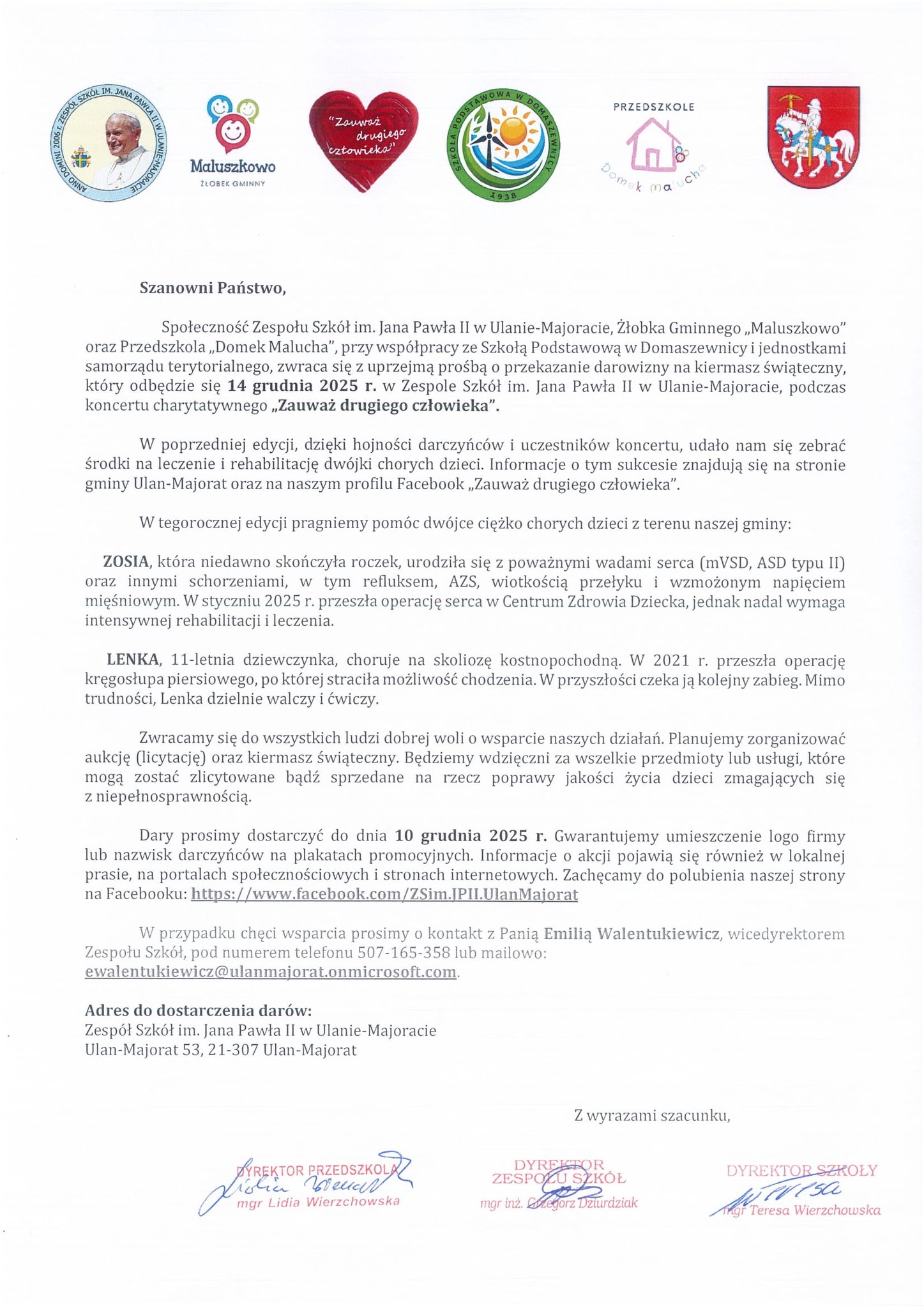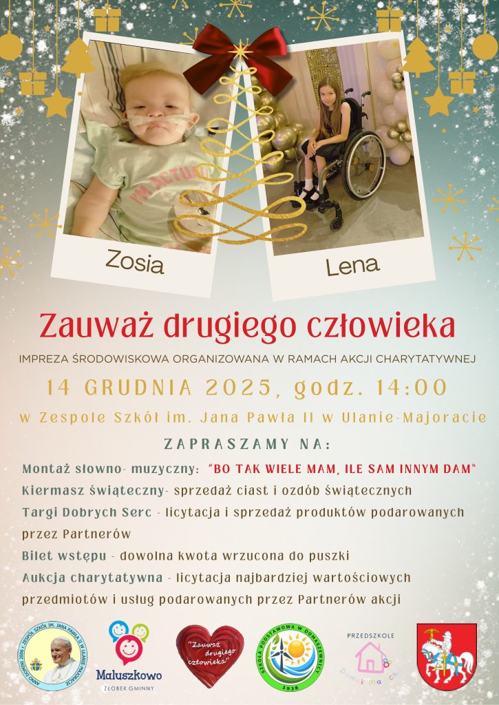 Społeczność gminnej oświaty oraz jednostek samorządu terytorialnego organizuje kiermasz świąteczny połączony z koncertem charytatywnym „Zauważ drugiego człowieka”, który odbędzie się