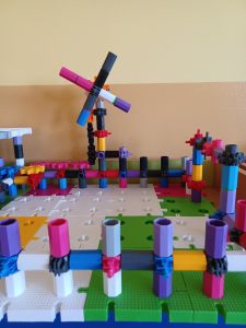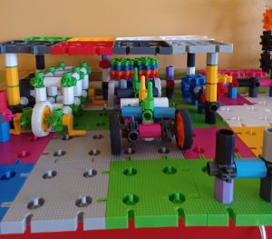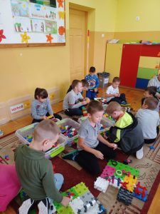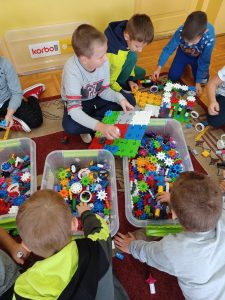 Klocki konstrukcyjne to specjalny rodzaj klocków, które posiadają dodatkowe funkcjonalności, urozmaicające zabawę i pozwalające na wznoszenie bardziej zaawansowanych konstrukcji. Świetnym przykładem tego rodzaju zabawki są klocki KORBO zakupione w naszej placówce w ramach programu Laboratoria Przyszłości. Charakterystycznym elementem zestawów KORBO jest koło zębate, które umożliwia wprawienie w ruch wszystkich zbudowanych z klocków konstrukcji – pod warunkiem ich prawidłowego połączenia, oczywiście. Wspierają logiczne myślenie i kreatywność, pozwalają zarówno na naukę „czytania” i postępowania zgodnie z instrukcjami, jak i projektowanie własnych budowli. Dziecko budujące wg wzoru (czyli zgodnie z instrukcją) – uczy się uważności w odtwarzaniu oraz różnych możliwości zastosowania poszczególnych elementów, a dziecko budujące bez wzoru (wg własnego pomysłu) – uruchamia wyobraźnię i uczy się planowania. Zabawa klockami to zabawa stwarzająca mnóstwo rozwojowych możliwości: kształtowania myślenia twórczego i produktywnego, rozwoju mowy, procesów zapamiętywania i procesu rozumowania. Zabawa klockami konstrukcyjnymi wpływa pozytywnie na rozwijanie sprawności umysłowej. Najmłodsze dzieci uczą się kolorów i kształtów, nieco starsze – liczenia i przeliczania, a jeszcze starsze – zasad prawidłowego łączenia elementów (takiego, który pozwoli na uzyskanie konkretnych, zaplanowanych rezultatów). Klocki to rozmaite elementy, różniące się między sobą wielkością, strukturą oraz sposobem łączenia. Układanie klocków i łączenie poszczególnych elementów wymaga cierpliwości i precyzji. To zabawy, które są prawdziwym „poligonem” dla dziecięcych rąk, umożliwiającym ćwiczenie i doskonalenie sprawności manualnej.